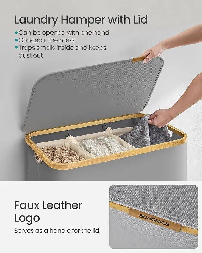 Голям кош за пране с 3 отделения, 150 л, Подвижна мрежеста подплата, Оксфордска материя, Бамбукови