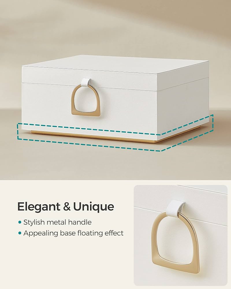 [Шиков и оригинален дизайн] Тази кутия за бижута е стилна, елегантна и поразително уникална, благодарение на комбинацията от бяло и златисто, елегантната метална дръжка, която улеснява отварянето и затварянето на капака, и отличителната основа с готин плаващ ефект.