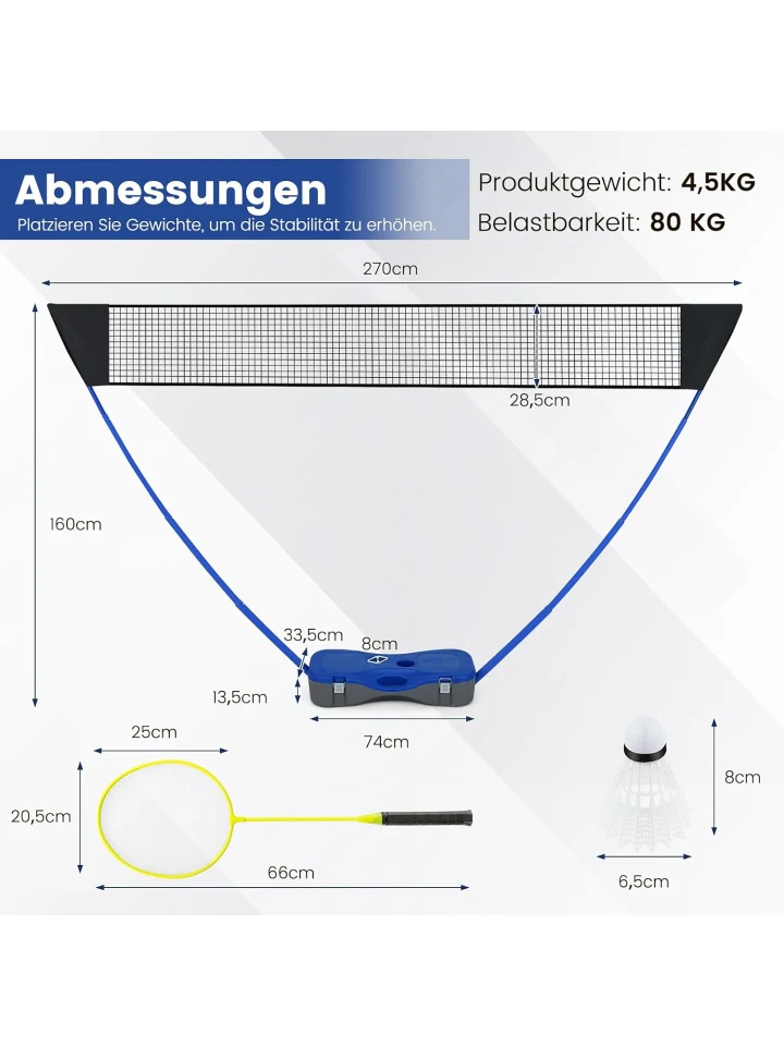 - Лесен за сглобяване: Този комплект за бадминтон изисква триетапен монтаж без инструменти. Просто разделете прътите и прикрепете двата пръта към основата. След това плъзнете мрежата върху пръта, за да завършите сглобяването.